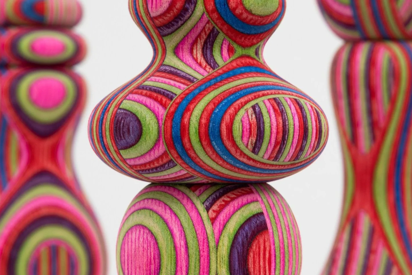 Louis Buhl & Co. is pleased to present a series of eight unique sculptures by artist Bayne Peterson. Historical precedents such as biomorphic abstraction, Modernism, and various craft traditions inform his works in dyed plywood, natural wood, and metal. Repeated lines, concentric ovals, and multiple sections of color arranged into an orthogonal grid appear to tilt, shift, and confound the eye.