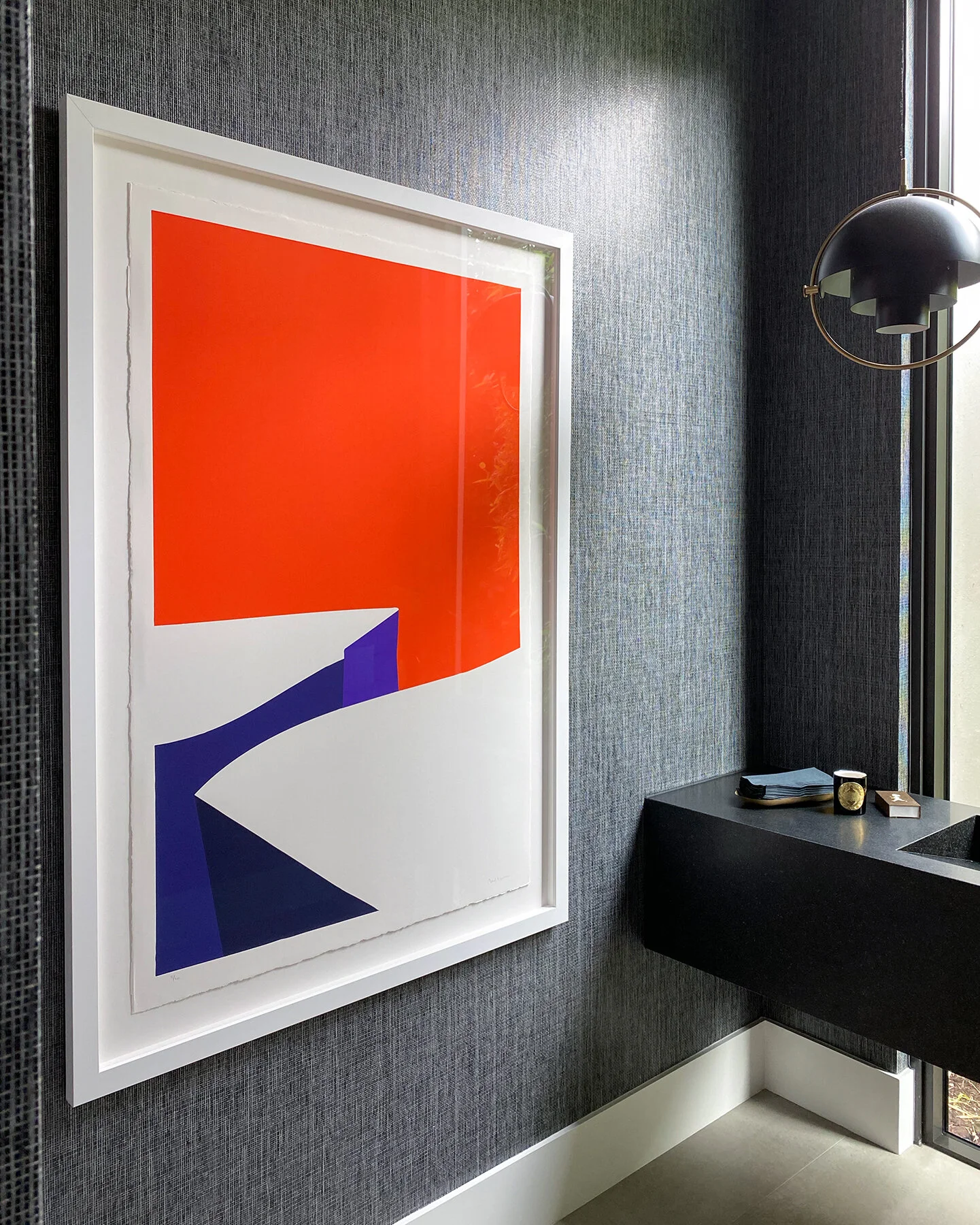 The first work I purchased was Kathryn Macnaughton’s Just Like Heaven, which currently hangs in my office. I ordered the hand-embellished version, as its uniqueness gave the print broader dimension. I love how it combines nature with silhouettes. I get the pleasure of that and Johnny Abrahams Untitled (Red) flanking the other side of the window. Having these pieces with my window viewing the courtyard isn’t a bad place to work.