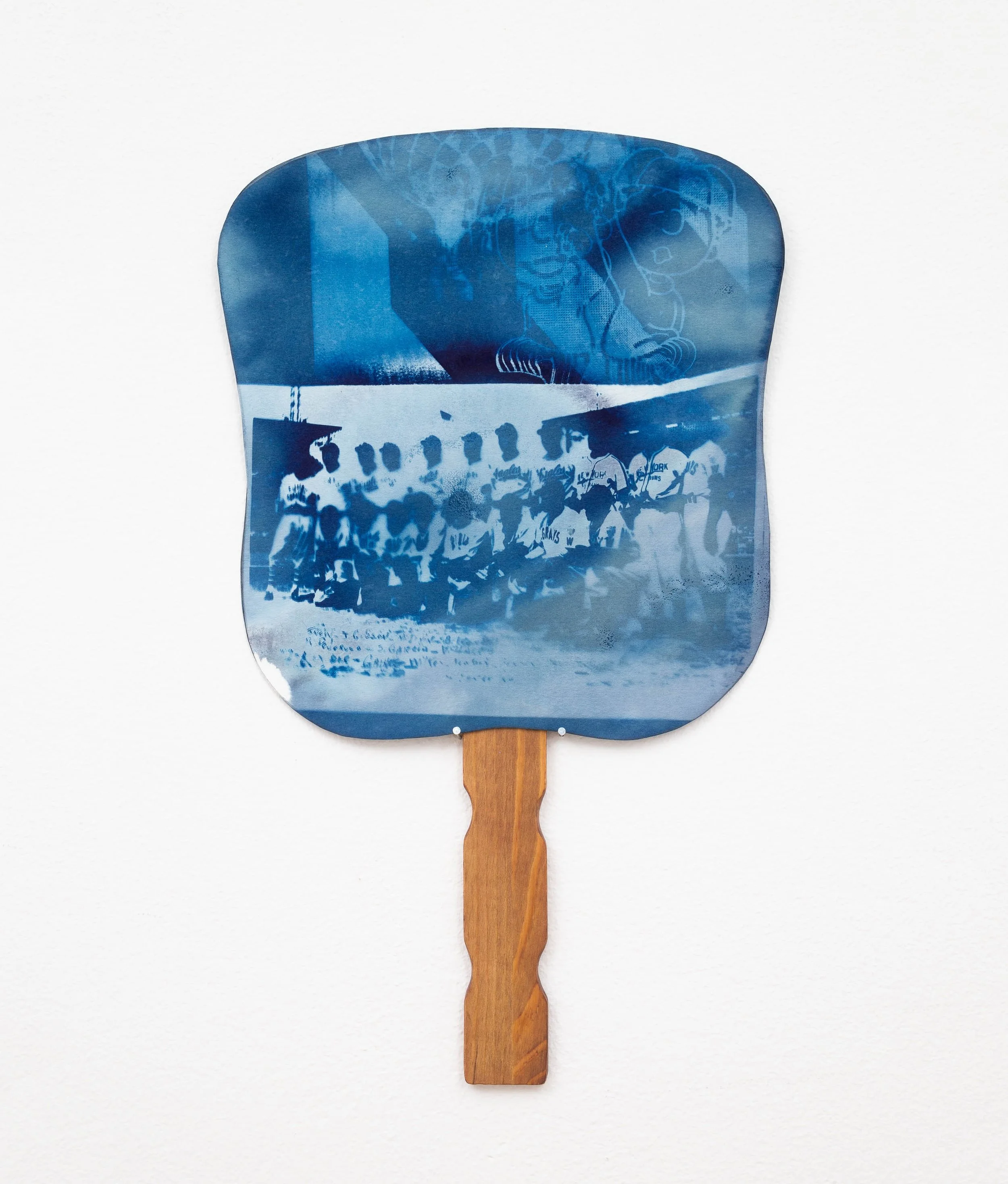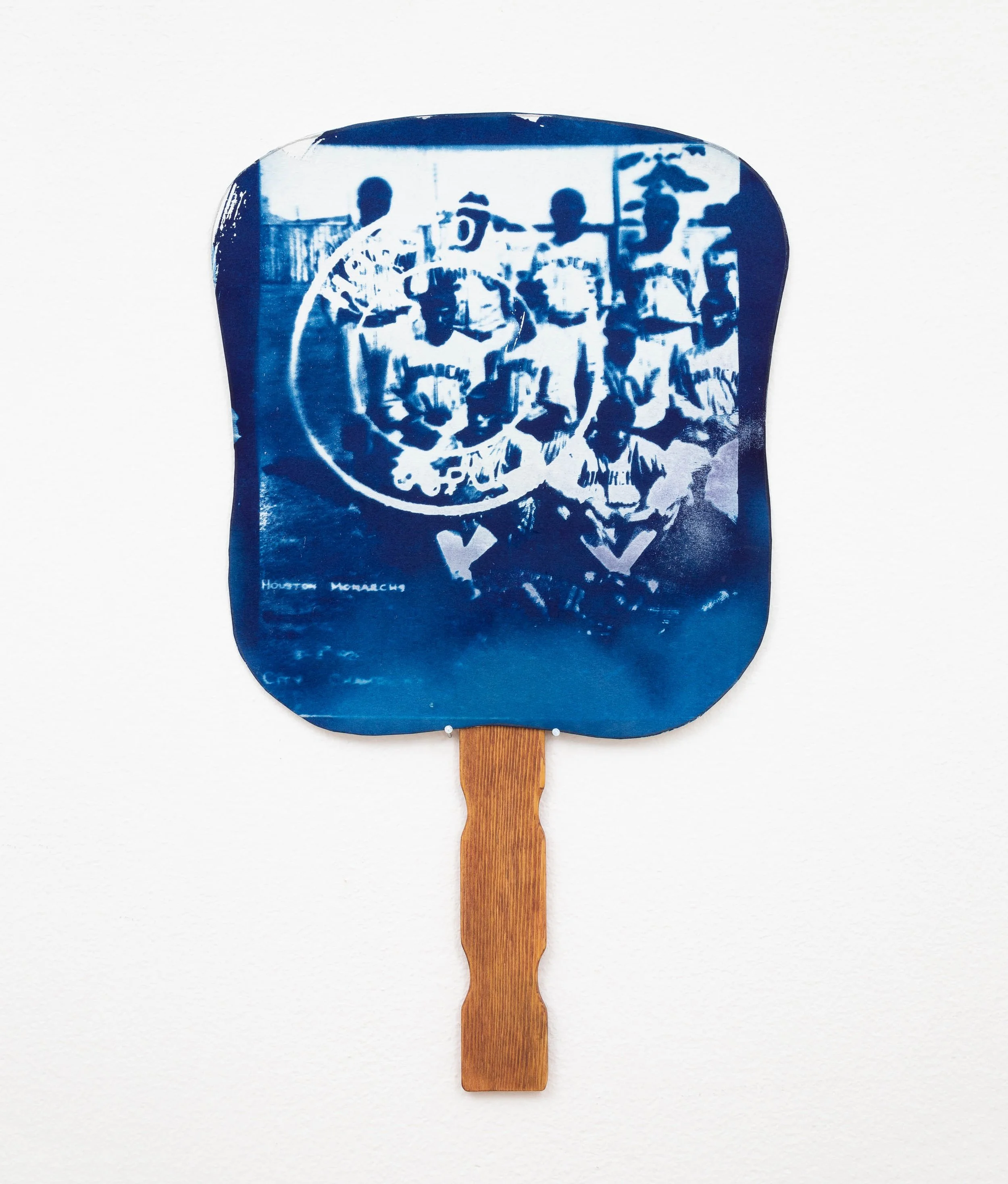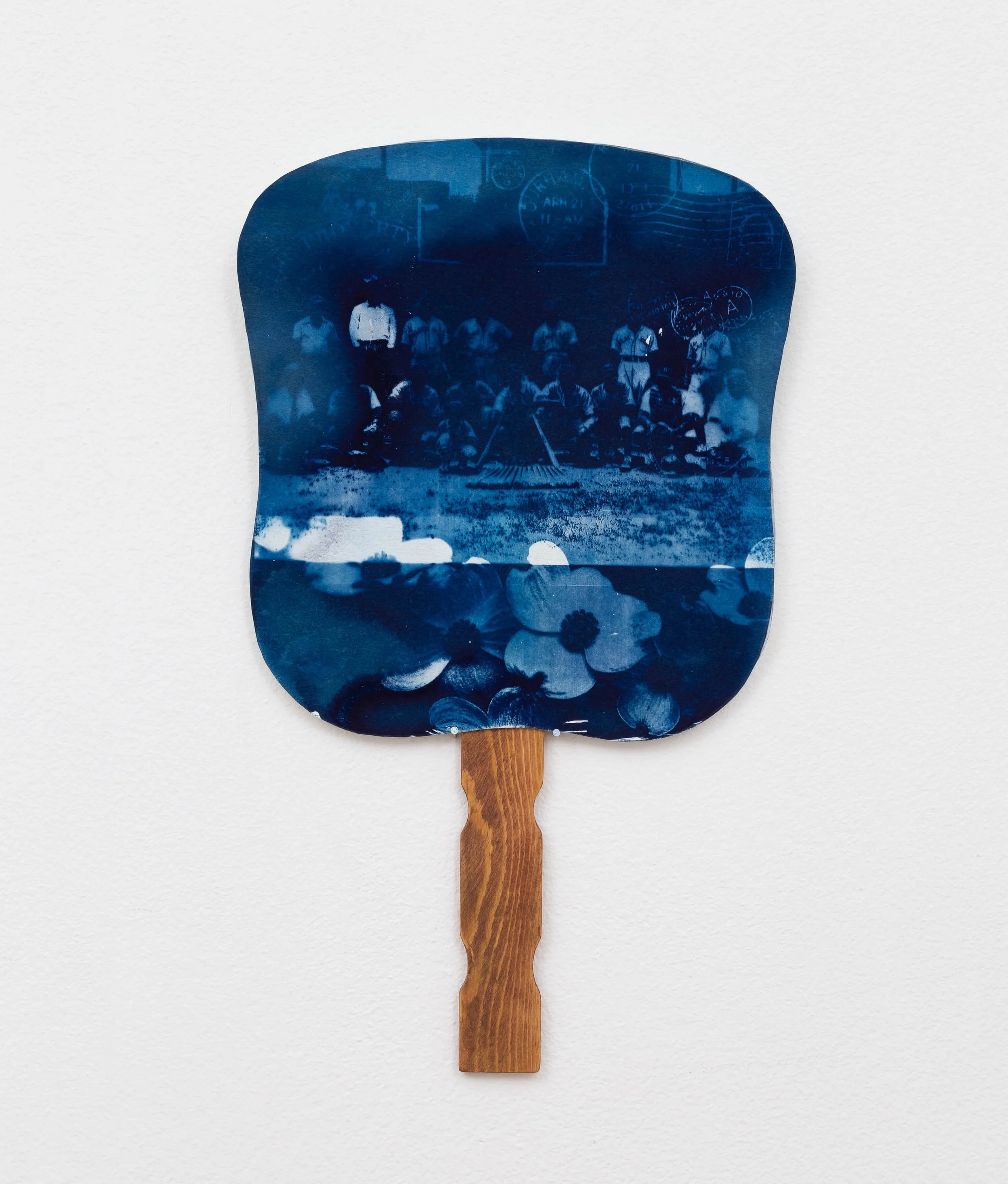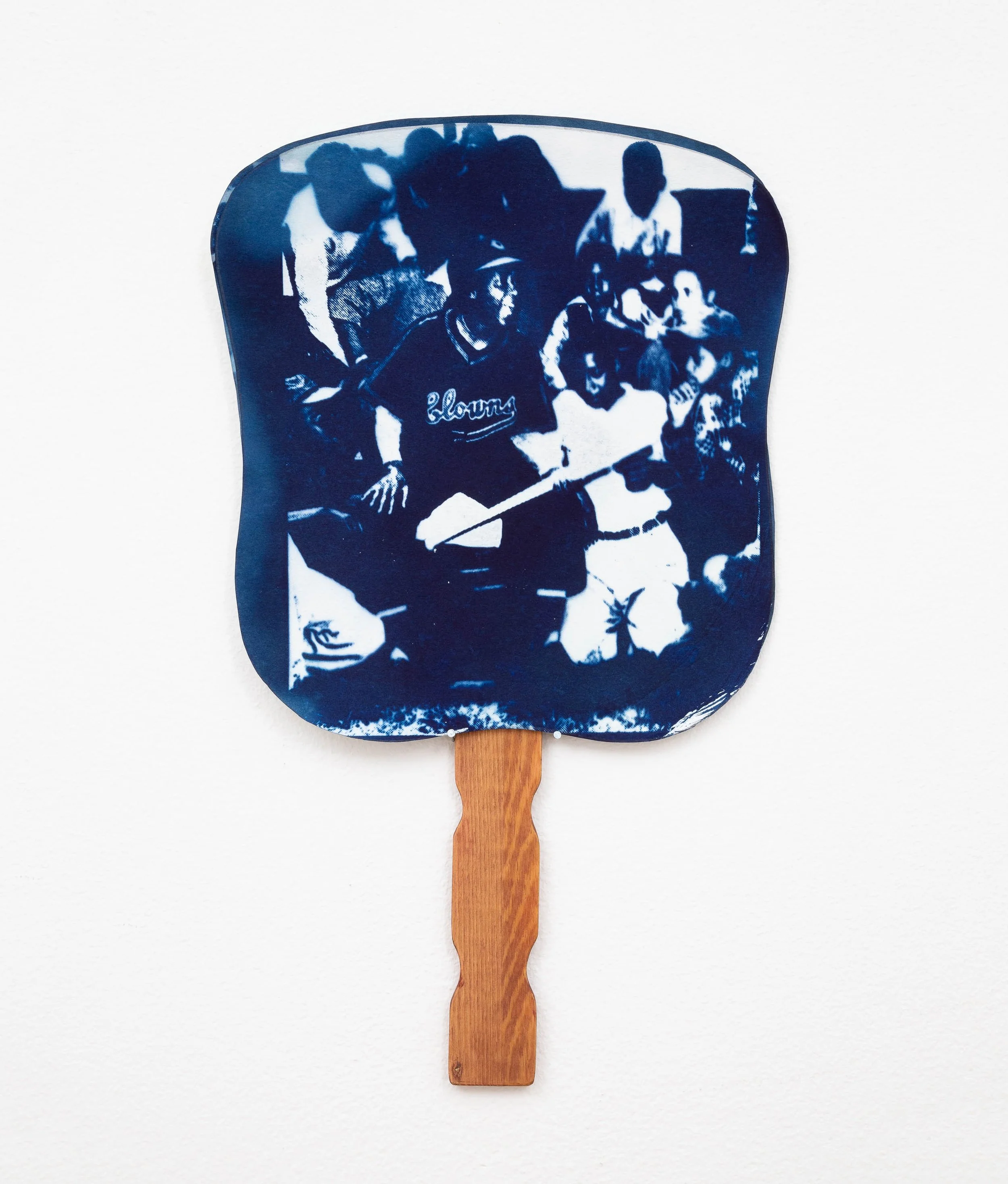 Since his time spent studying at Pratt where he received his MFA in 2019, Ward has become heavily influenced by and enamored with Arthur Jafa’s frankness and accuracy in describing what has felt like personal afflictions, only to learn that these feelings are responses to circumstance. Ward specifically references Jafa’s affinity for assemblage and mixed media work; as the artist and cinematographer explains, Black individuals often fixate on material because they once were considered that: raw material. Focusing on the exhibition’s cyanotypes, there is a discernible essence of reverence. However, the process of creating the body of work not only echoes Jafa’s words, but it also refers to the countless slaves, athletes, and Black ancestors that have been lost throughout time. As Ward describes it, “the act of creating a cyanotype is very much akin to the call and response of old hymns that were sung in the fields—often thought of as an act to boost morale, but truthfully, it was a call and response to see who all was still with them, just as the image is contrasting with the chemical solution and ultimately charged getting as (black and) blue as they want. A surface treated with the same hot sun that they toiled in, so it’s only right that I chose to commemorate them on a fan, not only as an act of a reprieve, but to reflect that congregation.”