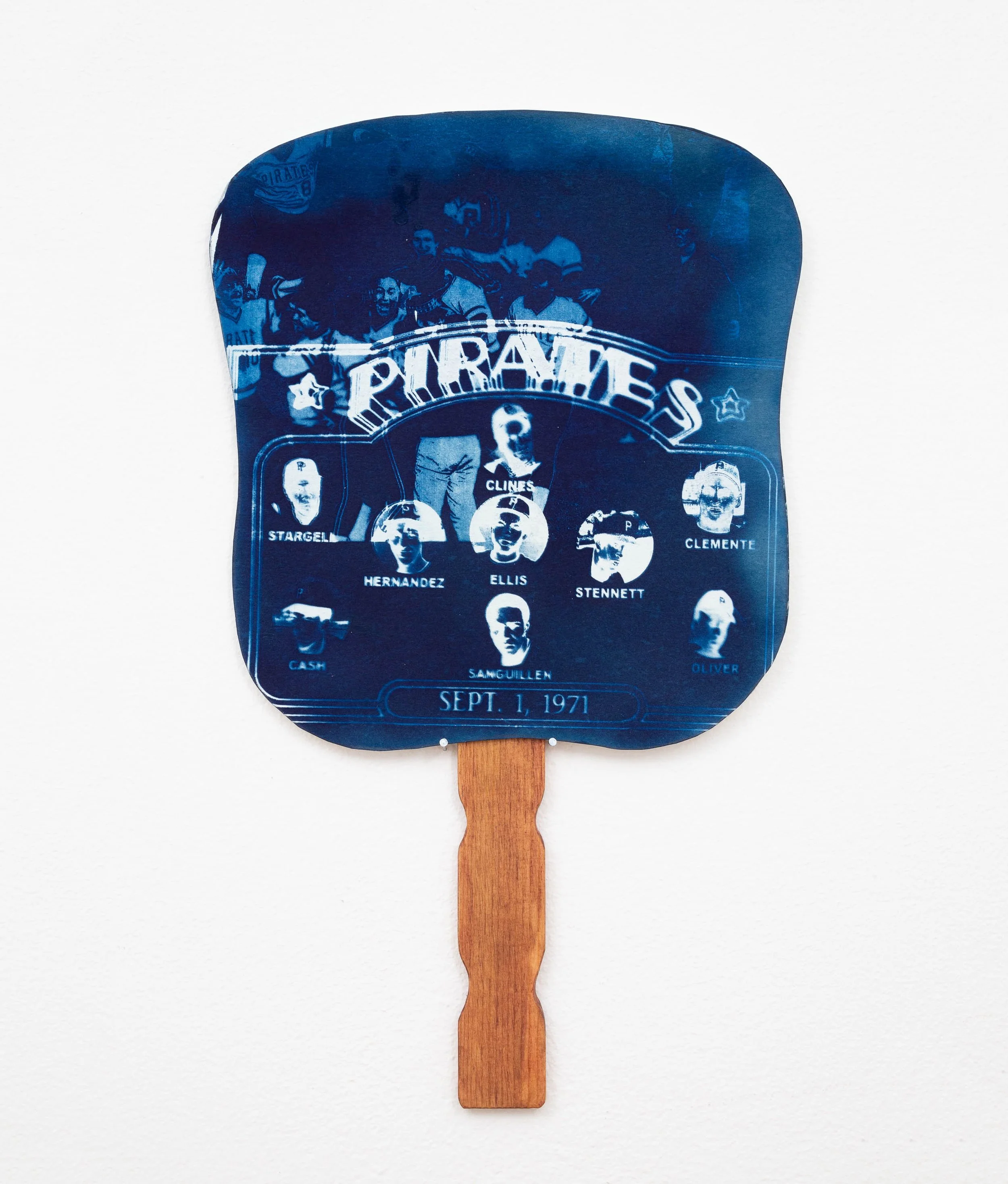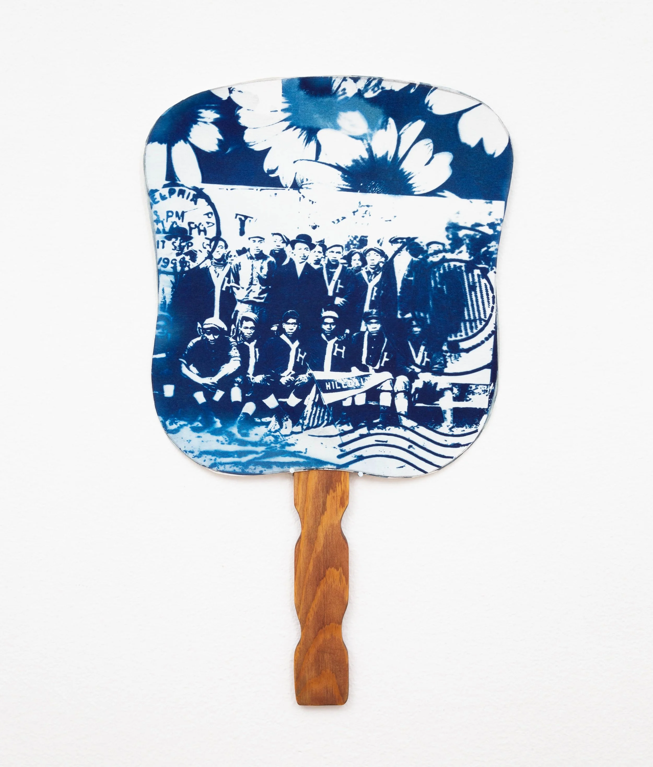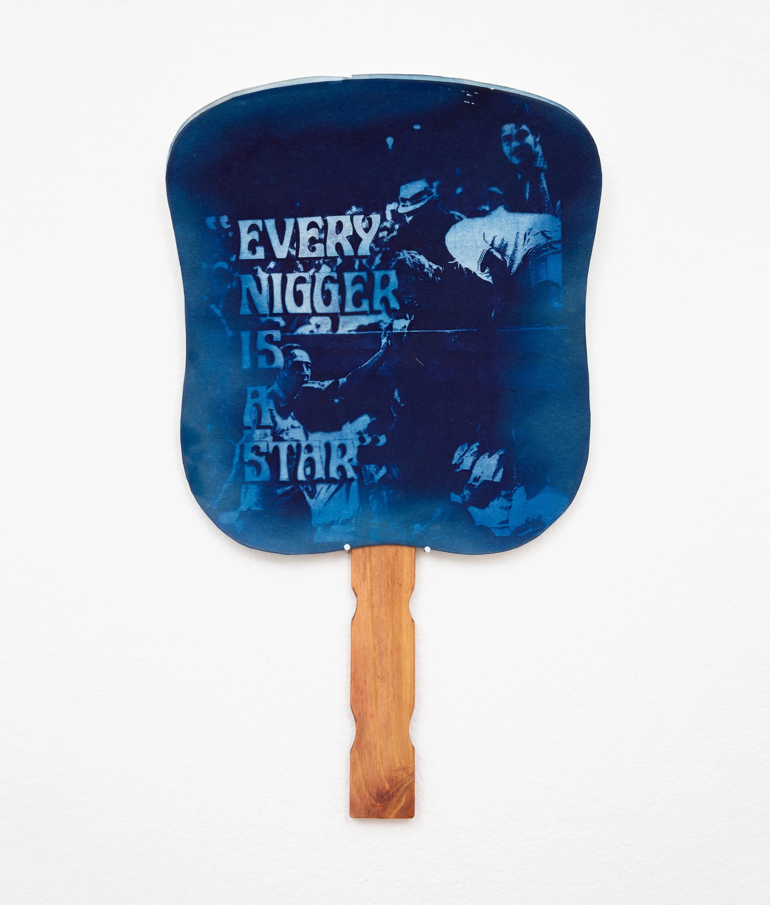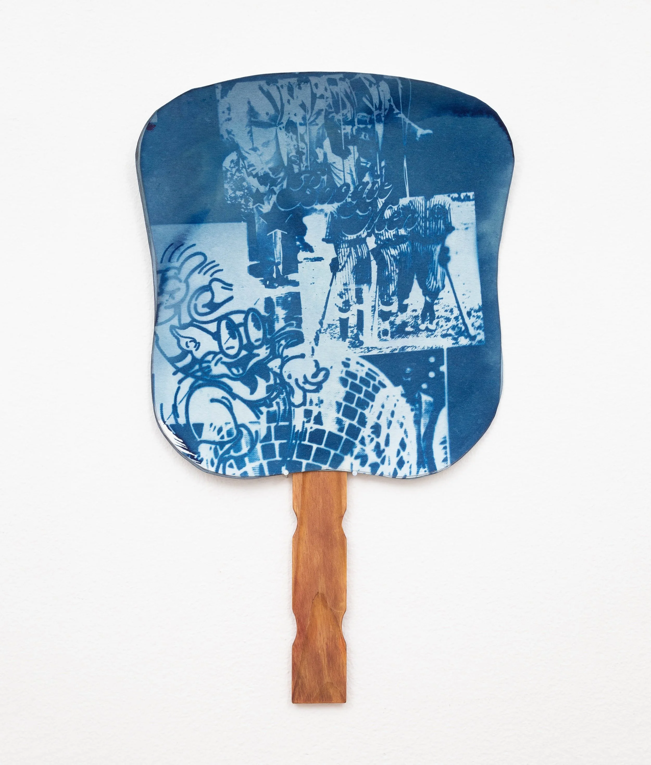Since his time spent studying at Pratt where he received his MFA in 2019, Ward has become heavily influenced by and enamored with Arthur Jafa’s frankness and accuracy in describing what has felt like personal afflictions, only to learn that these feelings are responses to circumstance. Ward specifically references Jafa’s affinity for assemblage and mixed media work; as the artist and cinematographer explains, Black individuals often fixate on material because they once were considered that: raw material. Focusing on the exhibition’s cyanotypes, there is a discernible essence of reverence. However, the process of creating the body of work not only echoes Jafa’s words, but it also refers to the countless slaves, athletes, and Black ancestors that have been lost throughout time. As Ward describes it, “the act of creating a cyanotype is very much akin to the call and response of old hymns that were sung in the fields—often thought of as an act to boost morale, but truthfully, it was a call and response to see who all was still with them, just as the image is contrasting with the chemical solution and ultimately charged getting as (black and) blue as they want. A surface treated with the same hot sun that they toiled in, so it’s only right that I chose to commemorate them on a fan, not only as an act of a reprieve, but to reflect that congregation.”