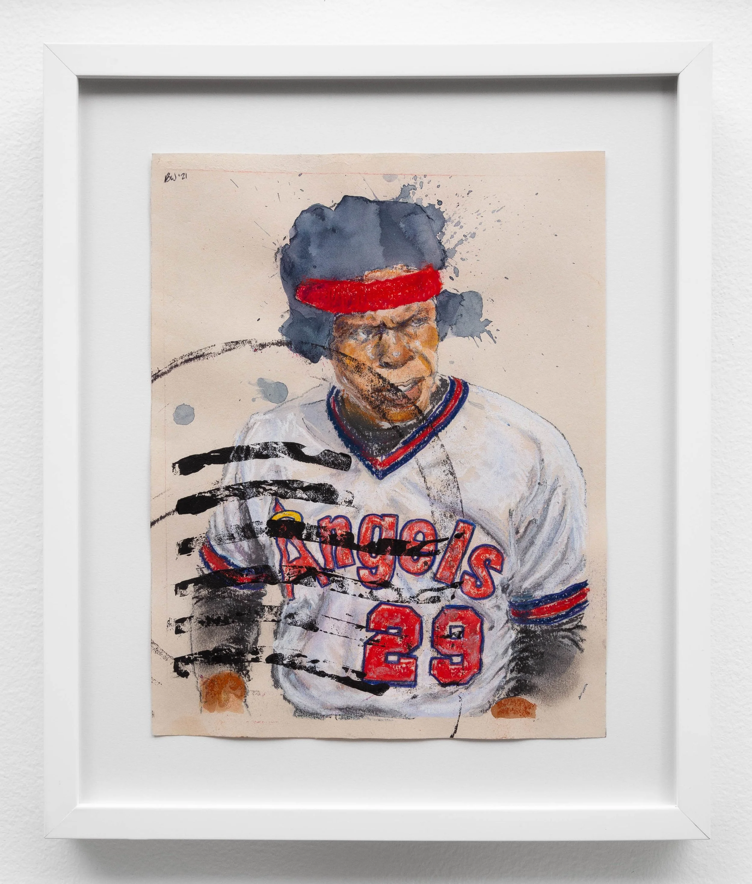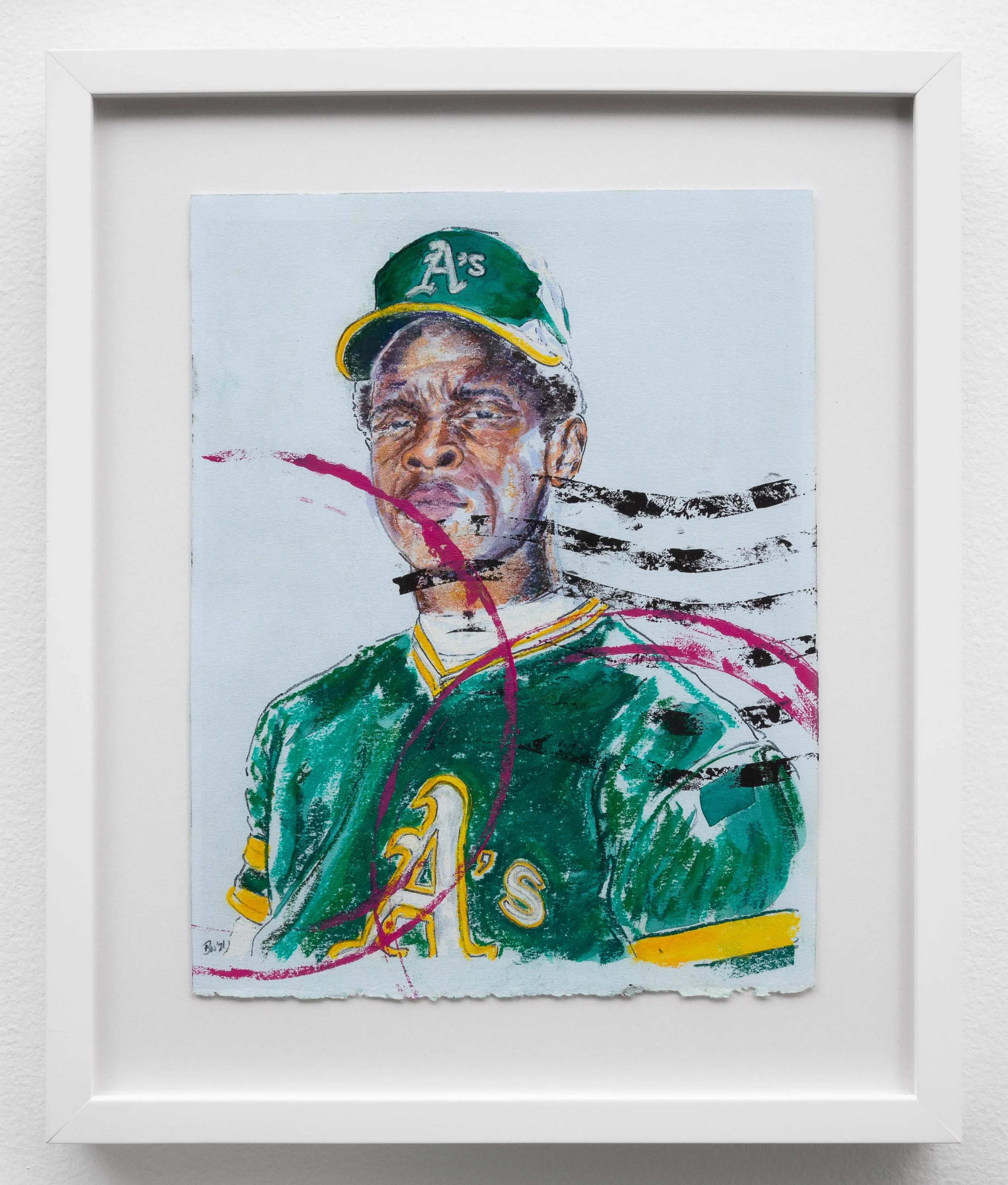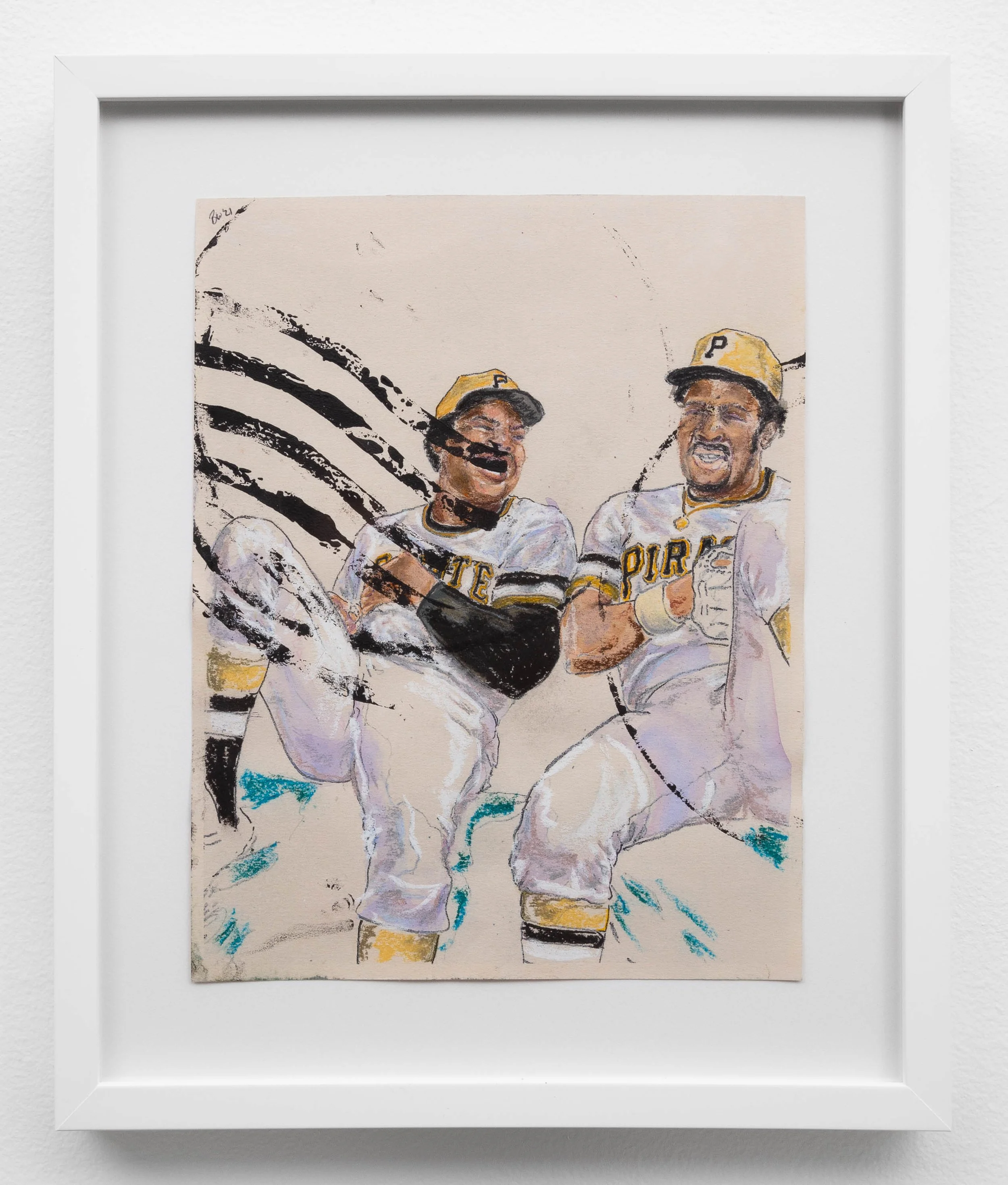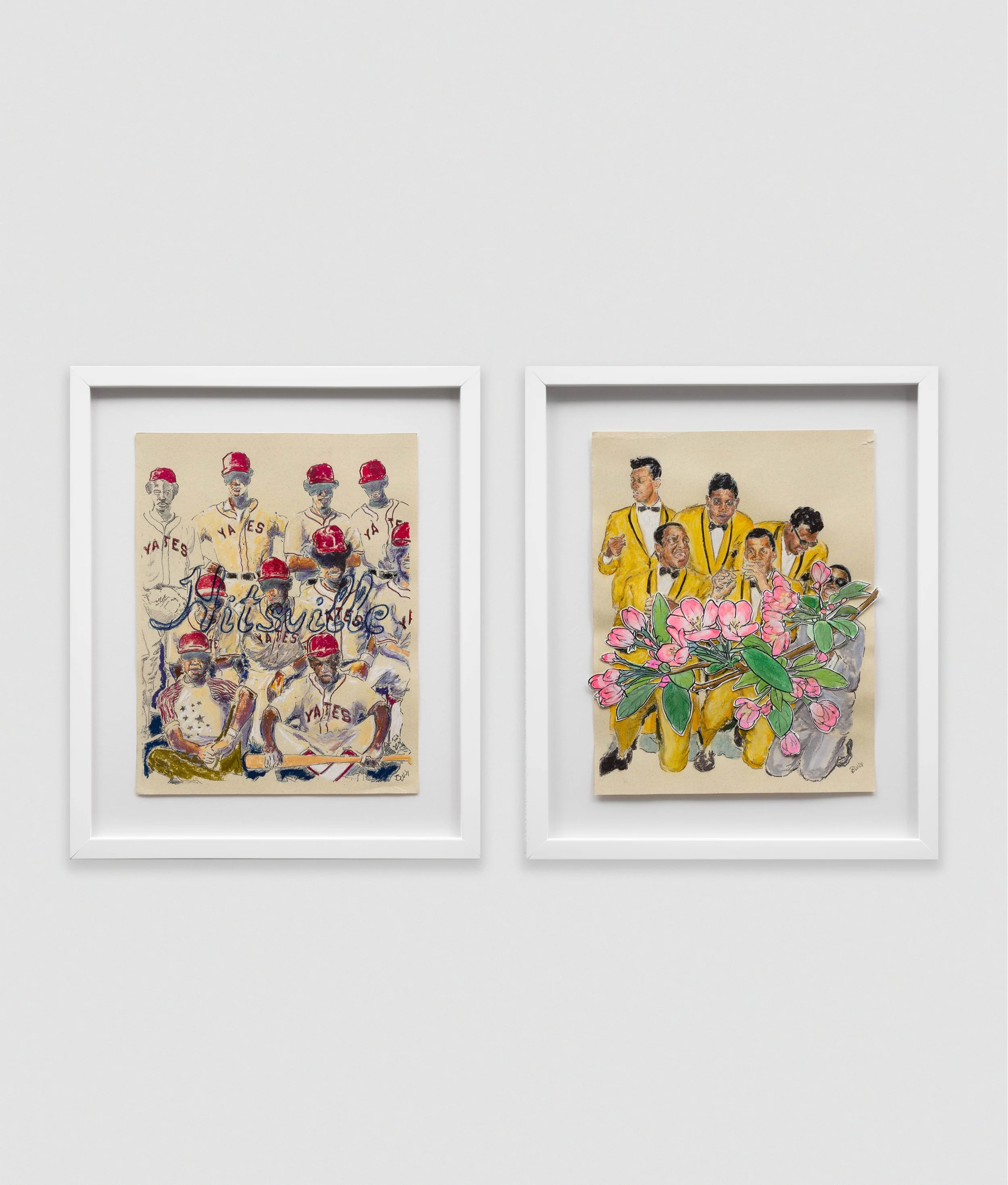 Ward’s practice is rooted in storytelling and research; all of the figures depicted within the exhibition works are real-life baseball players from different American baseball leagues throughout history that the artist has spent much time studying. In one of the portraits, Ward illustrates professional baseball outfielder Lou Brock, who spent most of his major league career playing for the St. Louis Cardinals. The Missouri state flower is collaged onto the piece to commemorate the player’s recent passing. On another, Ward illustrates the word “Hitsville,” a nickname given to Motown’s first-ever recording studio, across an image of his father’s high school baseball team (Jack Yates high school in Houston, TX). With this, Ward emphasizes the interconnectedness between sports and music within his personal life and Black culture in general. Other musical figures presented in the exhibition include spearheading soul group The Temptations; other baseball teams presented throughout include Major Leagues such as the Los Angeles Angels and the Pittsburgh Pirates, as well as Negro Leagues such as the Homestead Grays and the Hilldale Daisies. For Ward, sports, music, and art are all vehicles through which he has been able to define himself, and the lives and experiences of these Black performers have played an extraordinary role in his continuous journey to self discovery.