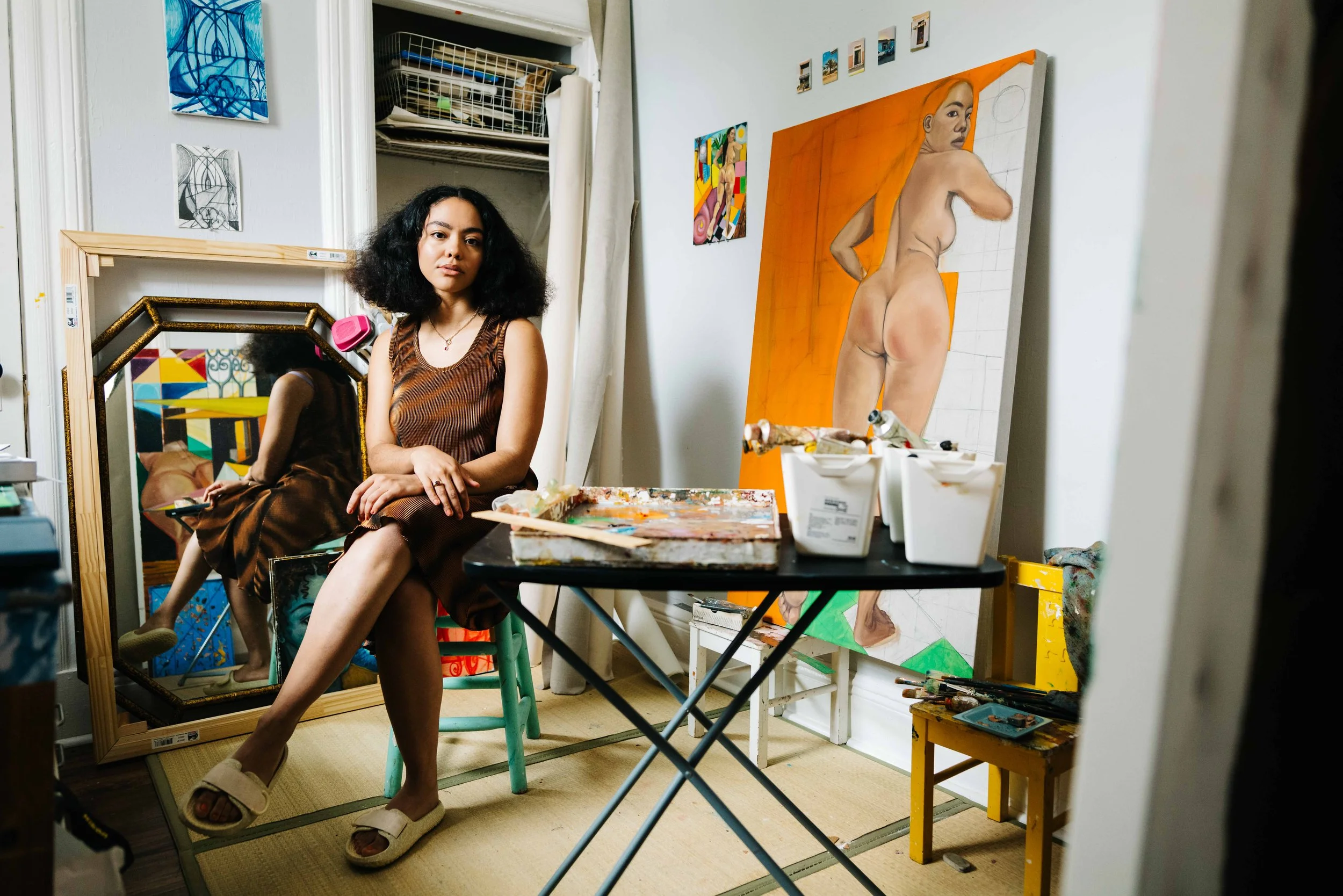 The vibrant colors of La Peregrina (Hopscotch) echo the artists’ Dominican heritage, which exists at the forefront of her practice. Drawing inspiration from the stories and traditions of her ancestors, Hernandez aims to create works with younger generations in mind, in hopes of providing a sense of visibility that was less pronounced in her own formative years. The work is autobiographical by nature, as the artist referenced photographs of herself as an initial point of departure. Hernandez emphasizes an interest in progressing her studies of the female form in relation to domestic interiors by taking the figure out of the confines of a set place and time. Through playful manipulation of perspective, she deconstructs her compositions and rearranges the elements into geometric dreamscapes that serve as visual metaphors for her active analysis of personal memories and relationships. In doing so, Hernandez depicts a space that is familiar yet constantly in flux, an environment that encapsulates and allows her to reflect on the abundance of experiences that have made her who she is today.