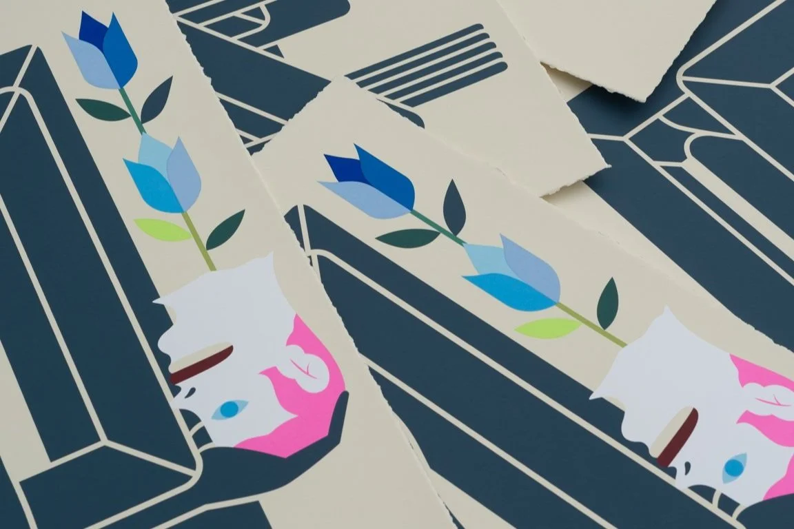 14-color Hand-Pulled Screen Print on Mohawk Superfine UltraWhite, 160 lb Cover Full Bleed. Deckled, numbered, and signed by the artist.