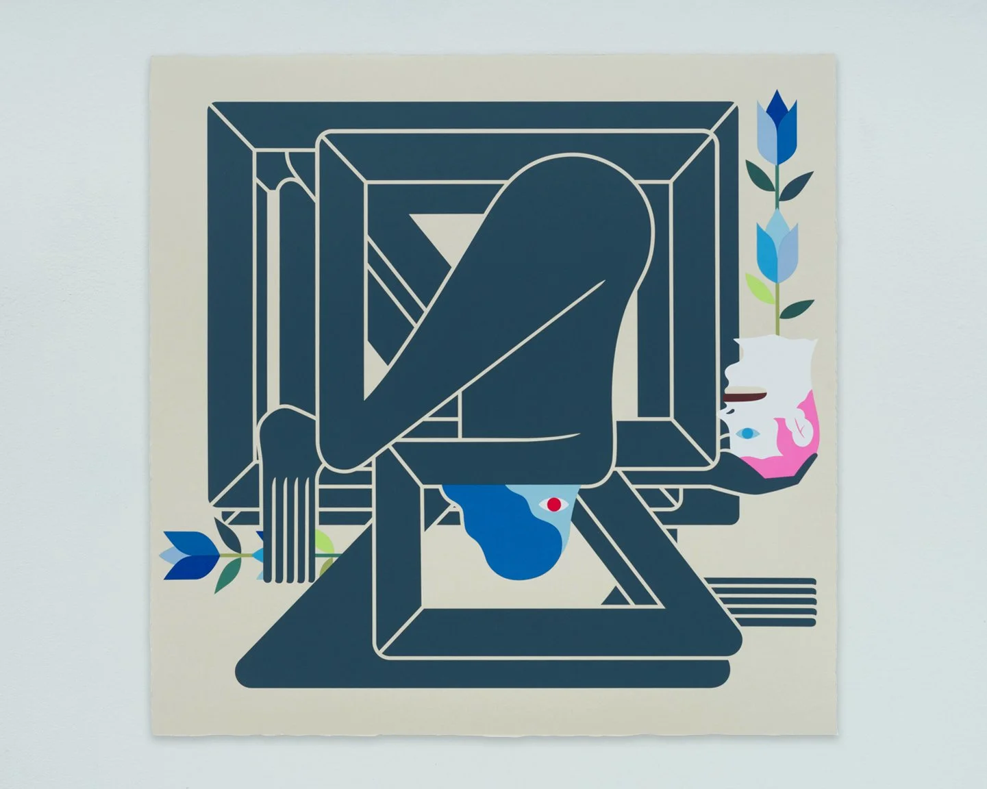 Signature to Colman's work, Blue Figure blends figurative imagery with bold geometry and vibrant colors. Illustrating a female protagonist with a bodiless male head resting upon the palm of her hand, Colman meticulously lays out each figure in a way where it is isolated yet seamlessly interwoven into the piece. At first glance, the subjects are distinguishable. Upon closer examination, their seemingly boundless limbs gradually fuse into the work’s background, making for a complex visual narrative.