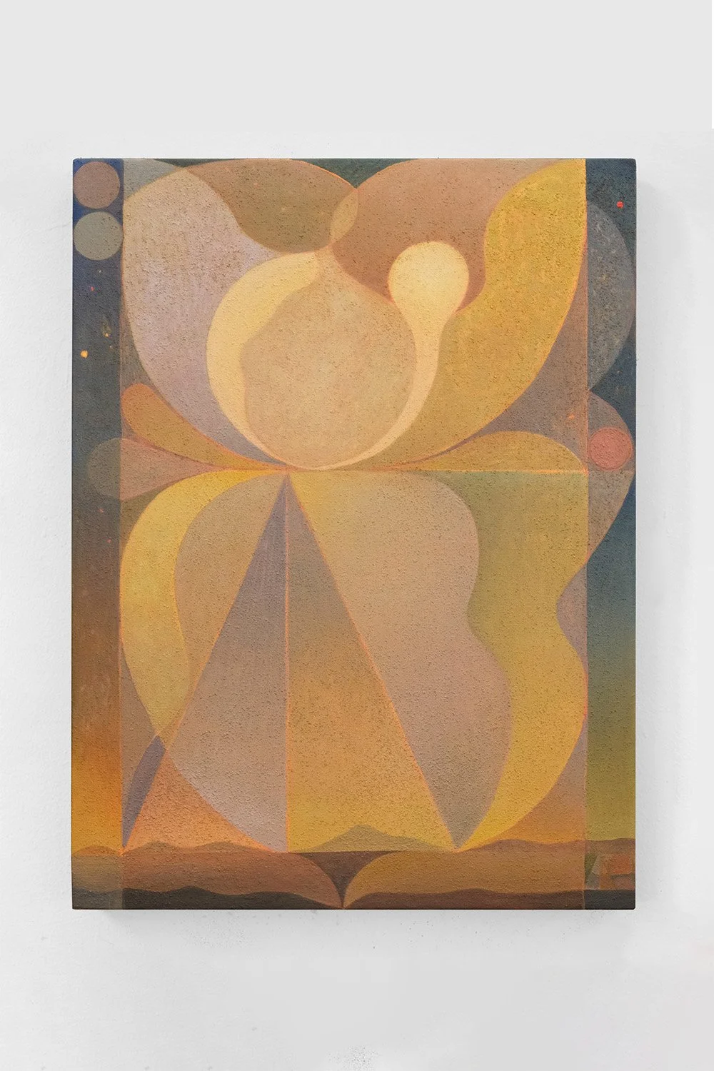 Exploring the subtle interplay of energy and form, Phillips layers hand-mixed pigments into paintings that hover between the logics of light, form, and movement. His compositions oscillate between order and spontaneity, often evoking the patchwork structure of quilts or the syncopation of musical rhythm. Taking a more gestural approach, Glasson stretches abstraction through color and movement, integrating surreal, layered imagery that merges the organic with the fantastical and explores themes of interconnectedness and environmental transformation. While Berger’s works introduce elements of figuration, they remain rooted in the same formal clarity that defines her counterparts. Symbolism and iconography ground Berger’s practice, serving as reminders of the persistent energy that endures within records of human existence.