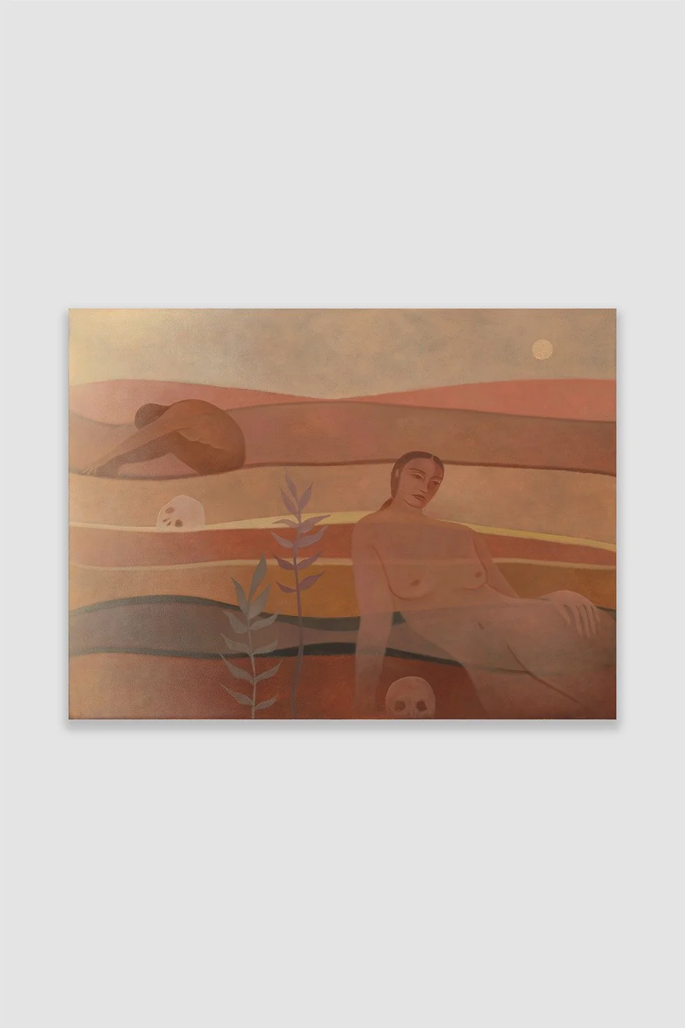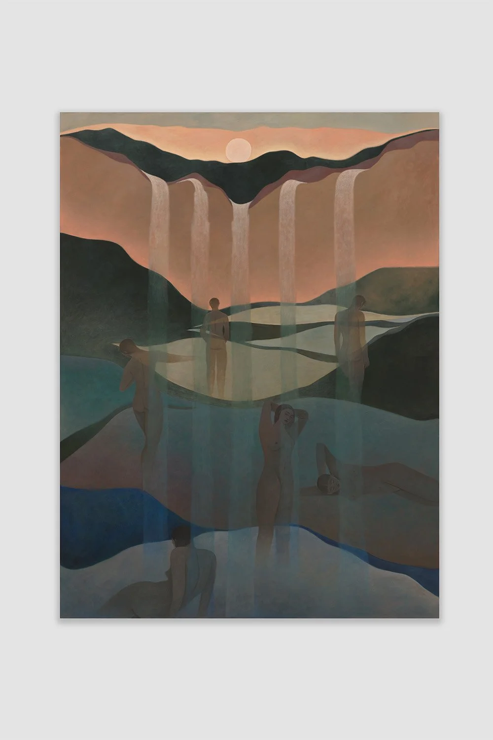 Though Phillips and Glasson work primarily through abstraction, both draw deeply from human experience: Phillips’s geometric harmonies mirror the sensory rhythms of daily perception, while Glasson’s surreal compositions evoke the psychic and ecological entanglement between people and the natural world. Berger’s stylized figures, meanwhile, engage in quiet acts of rest and connection, rendered in soft, balanced compositions that echo the structures of the surrounding works in the presentation.